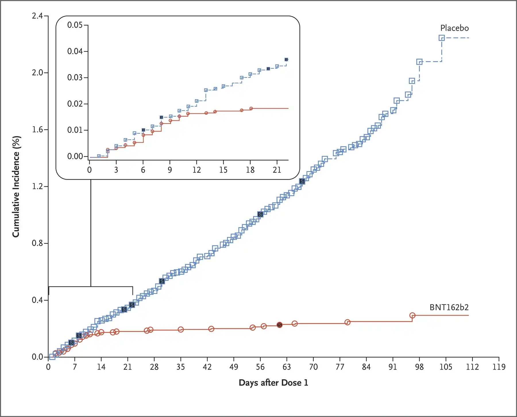 But when something really works, it shouldn't be hard to distinguish the effect from noise. For example, this chart from the phase III study of Pfizer's Covid-19 vaccine shows cumulative cases in the control (blue) and treatment (red) groups:
